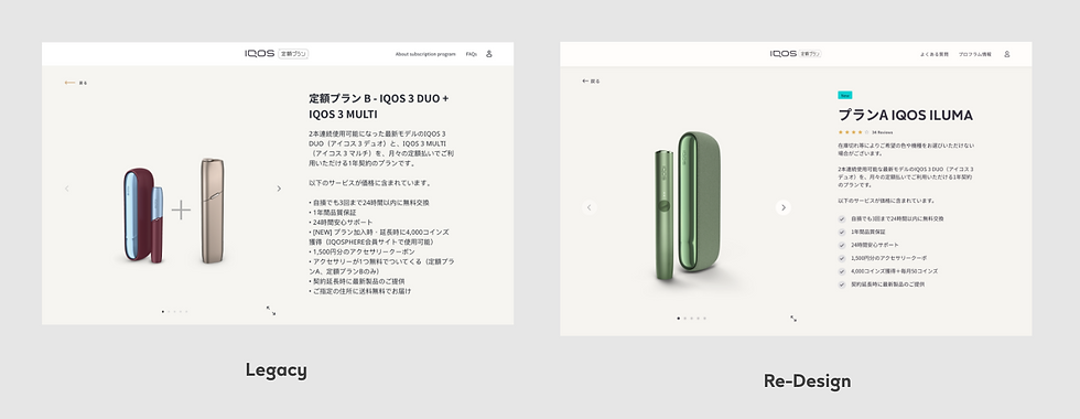 The IQOS subscription program is a crucial part of the IQOS service, offering an attractive device subscription service for customers through installment payments and comprehensive after-sales service. This helps to alleviate customers' burdens, address concerns about device malfunctions, and expand business opportunities. Accompanying the release of the new generation IQOS device and new brand guidelines, we have entirely revised the UI/UX design of the IQOS subscription website. The purpose of this is to provide a consistent customer experience across the entire IQOS service and to promote the sales of the new generation IQOS devices. IQOSの定額プランは、IQOSサービスの重要な一部であり、分割払いや充実したアフターサービスによって、顧客にとって魅力的なデバイスのサブスクリプションサービスを提供しています。これにより、顧客の負担を減らし、デバイスの故障に対する懸念を解消し、ビジネスの機会を拡大することができます。新世代のIQOSデバイスと新しいブランドガイドラインのリリースに伴い、私たちは定額プランのウェブサイトのUI/UXデザインを全面的に見直しました。その目的は、IQOSサービス全体で一貫した顧客体験を提供し、新世代のIQOSデバイスの販売を促進することです。